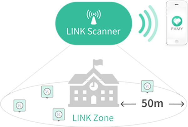 LINK 스캐너는 학교나 유치원에 설치되어 부모와 유치원 및 학교의 인솔자에게 아이의 위치를 보냅니다. 아이들이 일정 영역을 벗어났을 때, 부모나 선생님들에게 이탈에 대한 정보를 신호로 송신합니다.